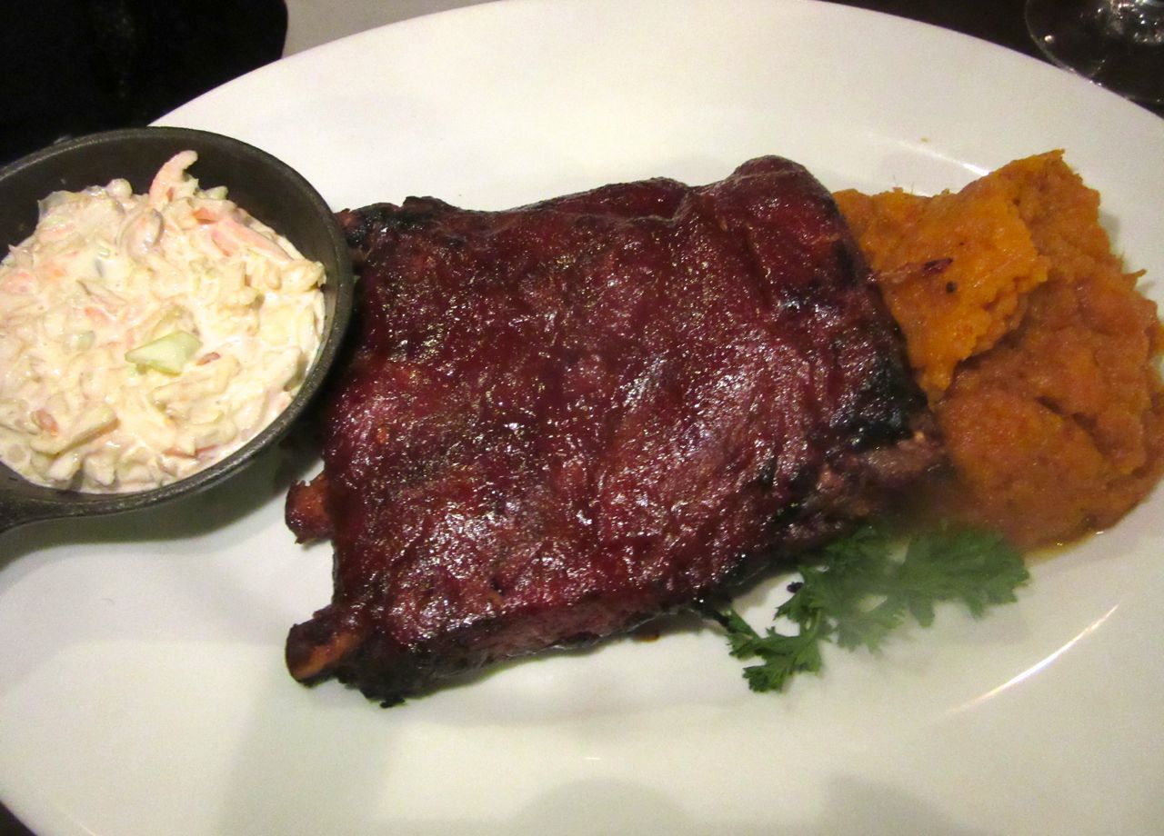 We share everything as we always do. St. Louis ribs slow-cooked and caramelized, fall-off-the-bone- style, are not my favorite style of ribs. The whipped sweet potatoes alongside are very sweet, the cole- slaw very creamy. Smoked turkey collards, very sweet too.