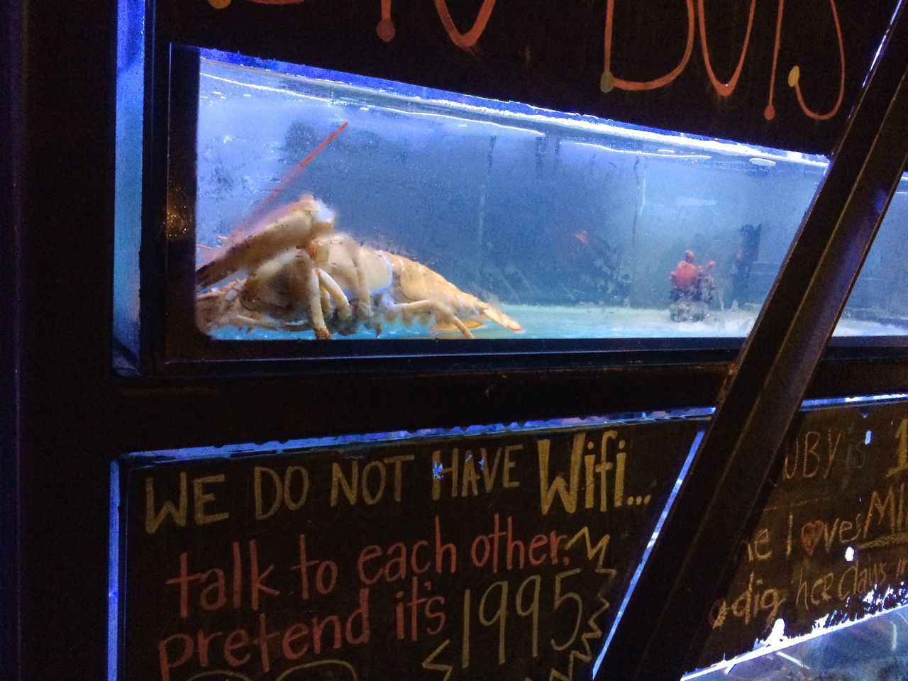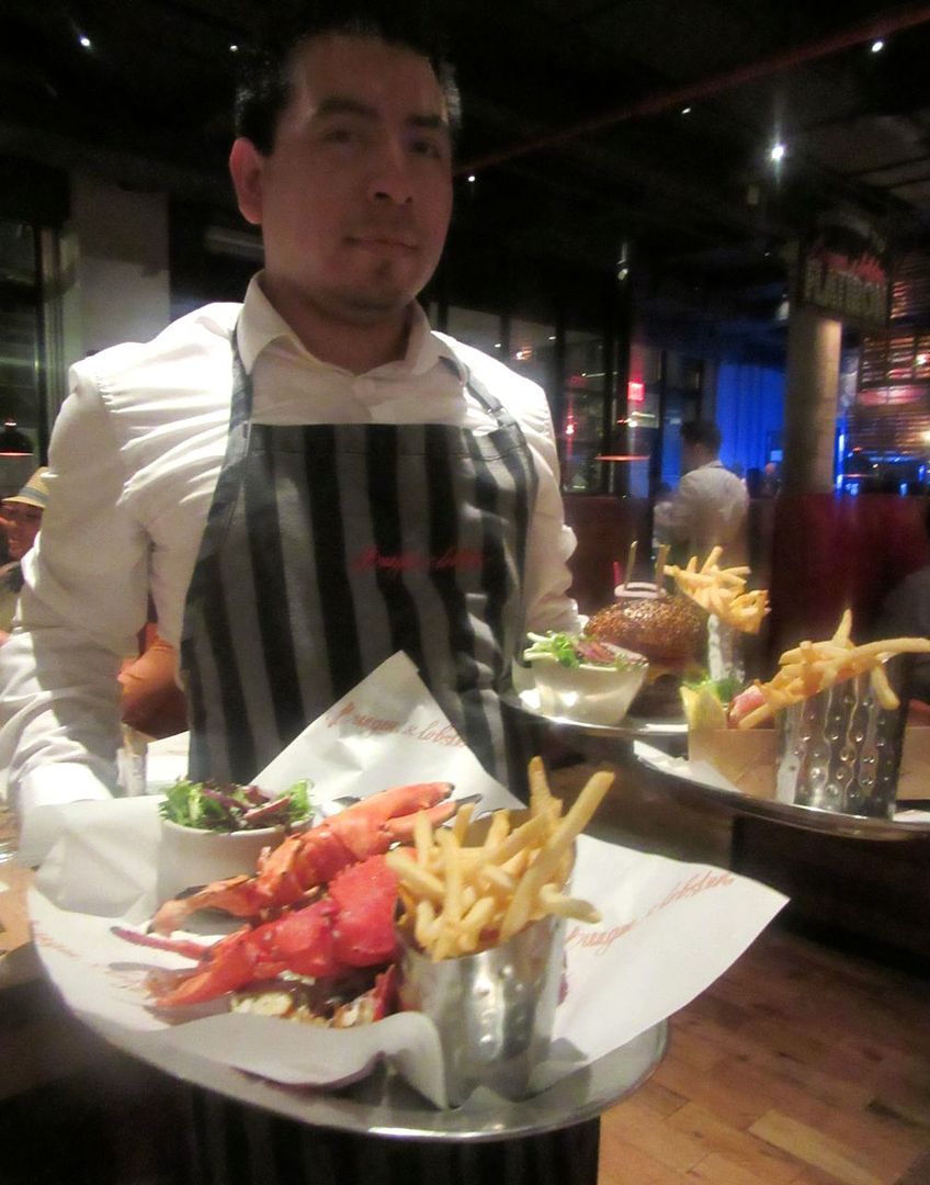 I’m not suggesting that longtime Insatiable Critic followers need to shadow me here. I can call it research. But maybe it’s not only young’uns who relish not straining the brain at dinner. It could become a trend. There are now 17 Burger & Lobsters worldwide, twelve in London, and one each in Bath, Cardiff, Manchester, Dubai, Kuwait, Stockholm, Saudi Arabia, and this one where Ruby the yellow lobster floats in her own private pool, waiting to move to the Long Island Aquarium in Riverhead.