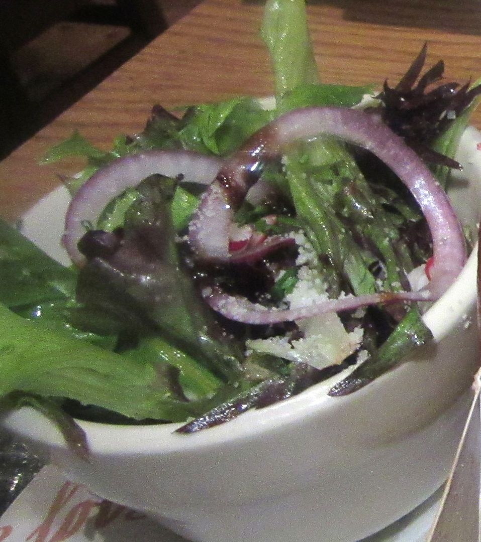 The salad of greens and red onion with powdered cheese, tossed too far ahead, is sadly soggy.