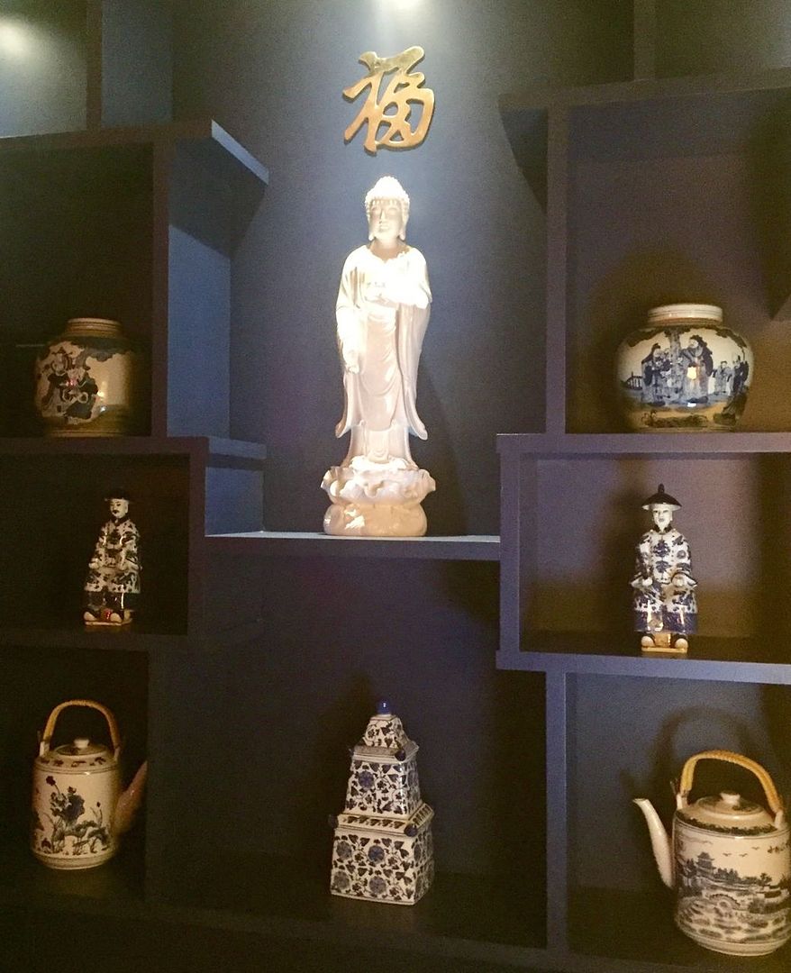 Once those annoyances are overcome, any residual grumpiness fades, chased by the unusual charm of the setting. It’s very Tea House of the August Moon, with pierced screens separating tables, blue and white vases on shelves, a porcelain Buddha, old teapots, and other vintage and flea market Chinoiserie. A small, white shaded boudoir lamp and white hydrangeas in a Delft vase sit on the blue and white tiled shelf above our booth. Why is it so gorgeous? One of the partners is a decorator, I am told.