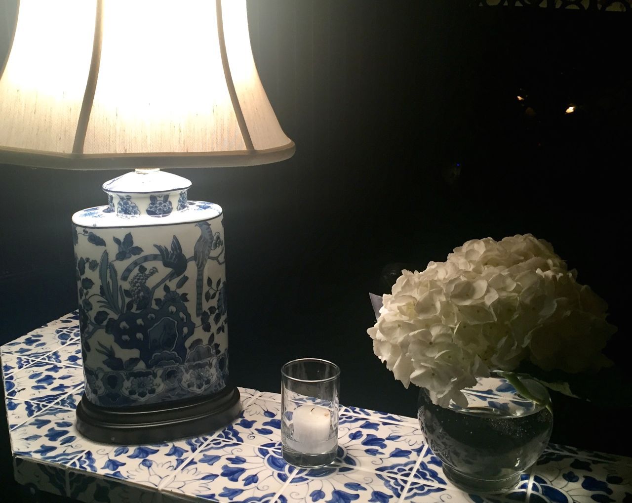 A shaded boudoir lamp and white hydrangeas in a Delft vase sit on the blue and white tiled shelf above us.