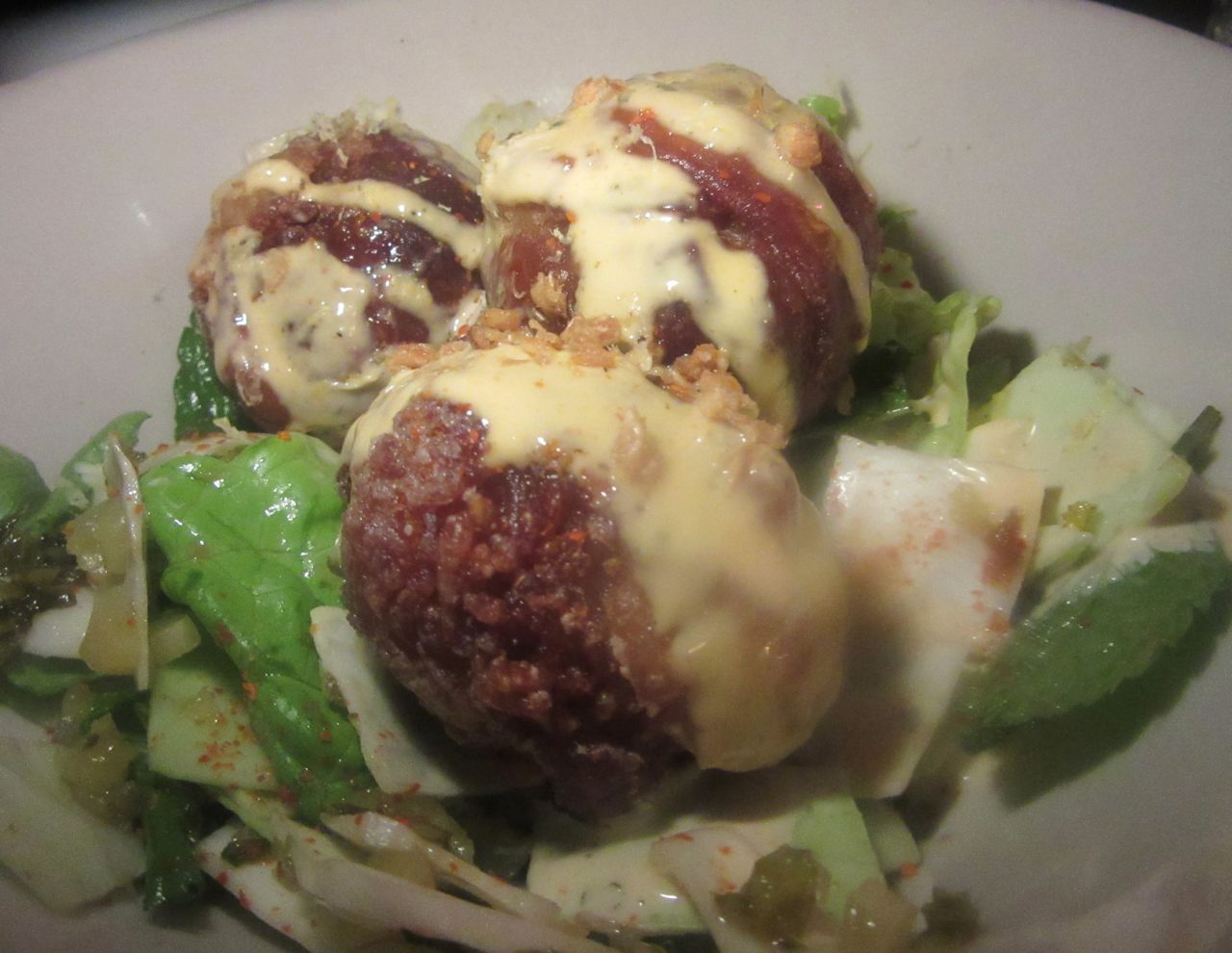 Chicken skin dumplings are formed from sweet tea rice with dried shrimp and painted with spicy mayo.