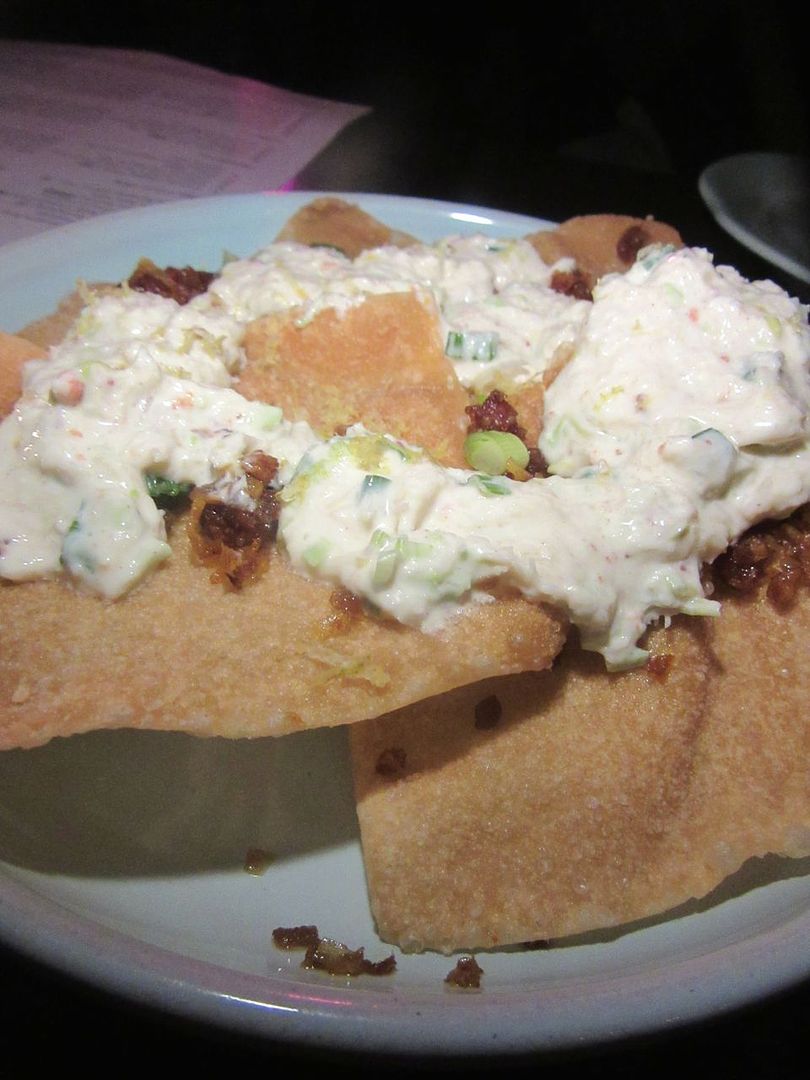 “Crisp Rangoon Nacho XO” is especially left field. I order it to keep us amused while waiting for late arrivals. Imagine crab-infused cream cheese on crispy wonton skin crackers with XO sauce. (Typically, dried scallop, dried shrimp, red chile pepper, Jinhau ham and garlic.) One bite is enough for my out of town kin. Yes, it’s weird, and yes, I like it. So there I am finishing it.