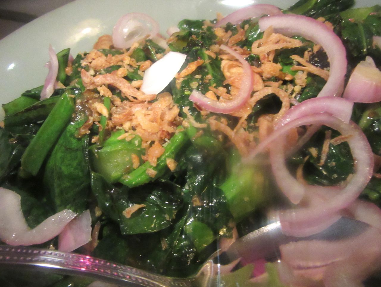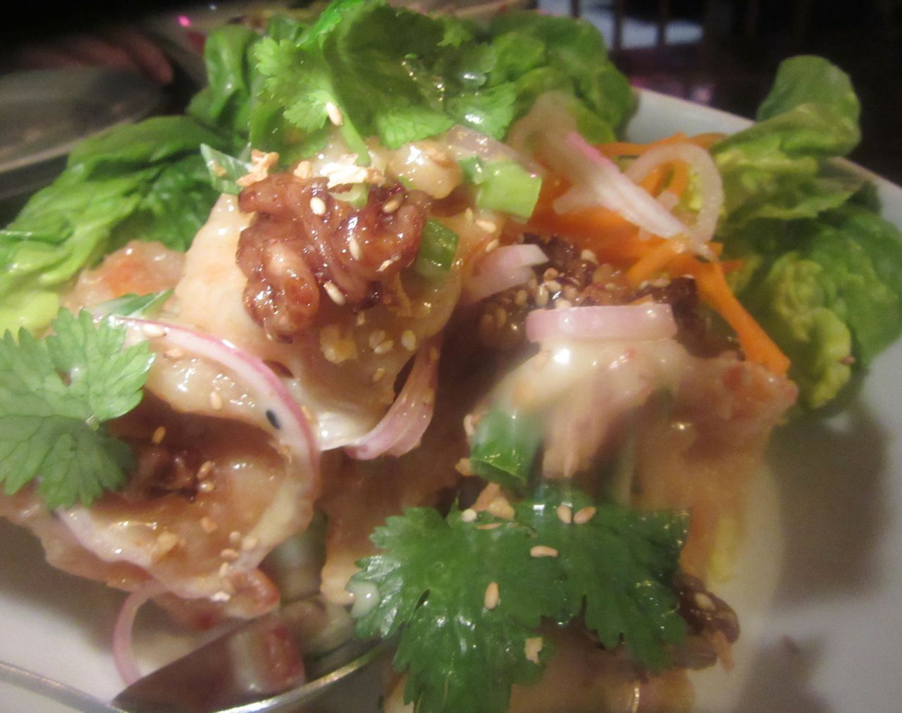 Of course I tend to be pushy, but in this case, with so many unknowns on the menu, my friends are willing to let me dive in and direct. I go for the whimsy, not expecting much from chicken skin dumplings. They turn out to be delicious, soft little balls of tea-flavored rice with dried shrimp, swathed with spicy mayonnaise, surrounded by chunky cabbage slaw.