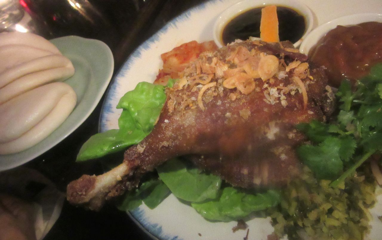 A confit duck leg comes with little buns, Beijing spices, hoisin sauce and lettuces: Peking duck in essence.