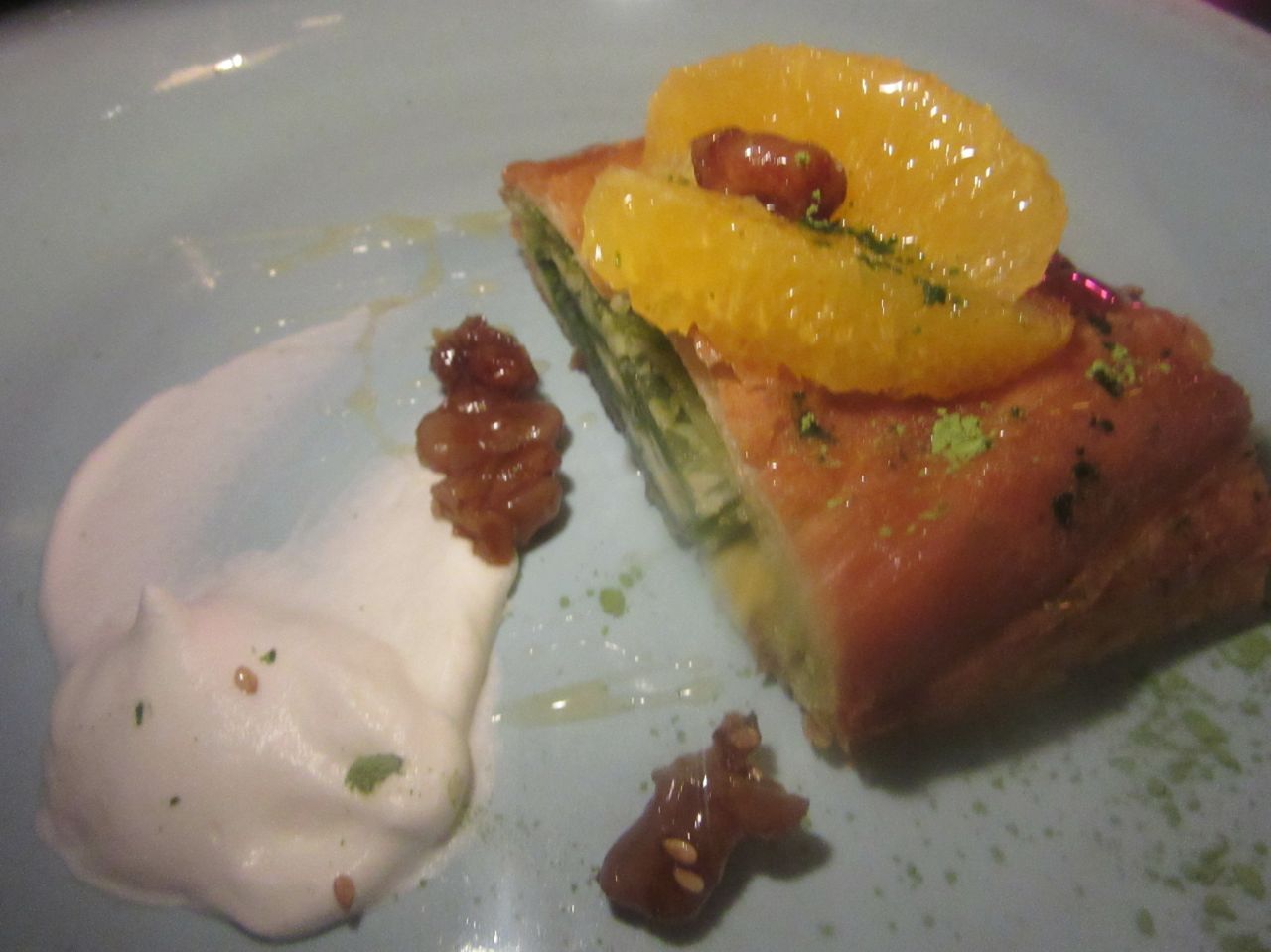 Orange and green tea pastry with white chocolate and homemade whipped cream.