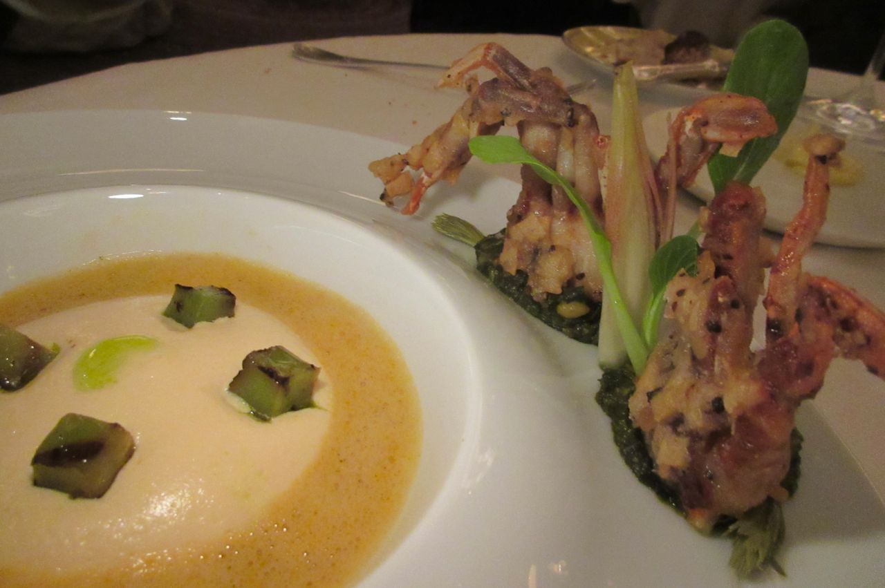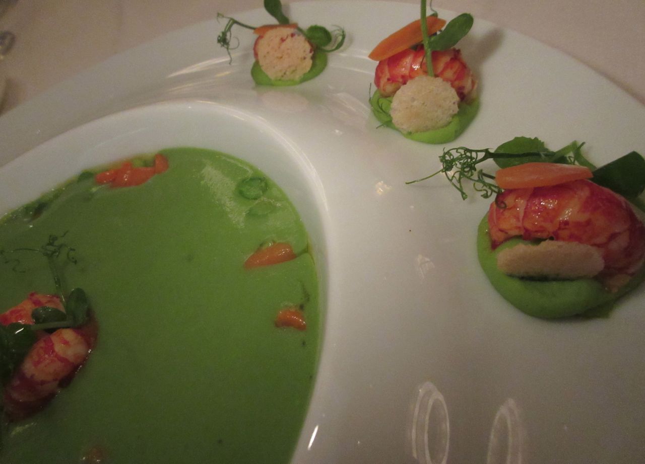 It’s spring. Of course, there will be pea soup. If there were an official flag for spring, it would be the intense, almost iridescent green of Daniel’s minted green fusion. I watch as the waiter pours it around an island of crayfish in the shiny white soup bowl. The trio of bright orange crayfish anchored in islands of green puree on the indented edge strike me as overly fussy.