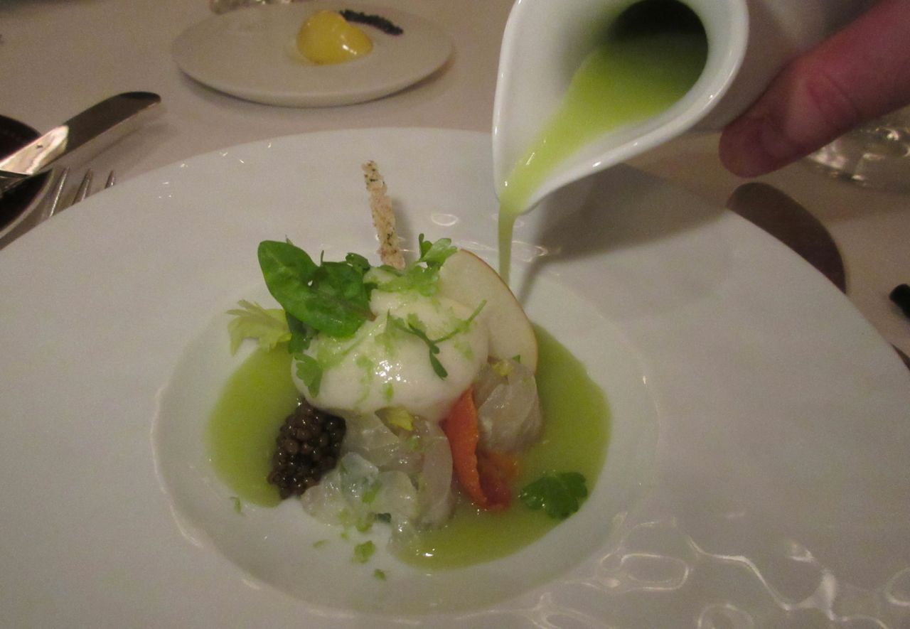 A Granny Smith consommé is poured around local fluke with sea urchin and white sturgeon caviar.