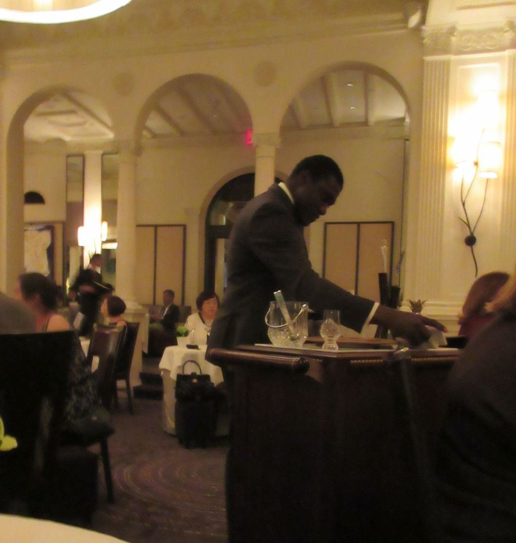 Is it possible the staff has doubled? Or is it just that half the tables have disappeared? A parade of drilled cadets and familiars, possibly recycled from Downton Abbey, marches attendance. There’s theater, too. At one point a bartender sets up a moveable podium in the center of the room and crushes fruit, using a series of long paint brushes to add his muddle to a Planter’s Punch.