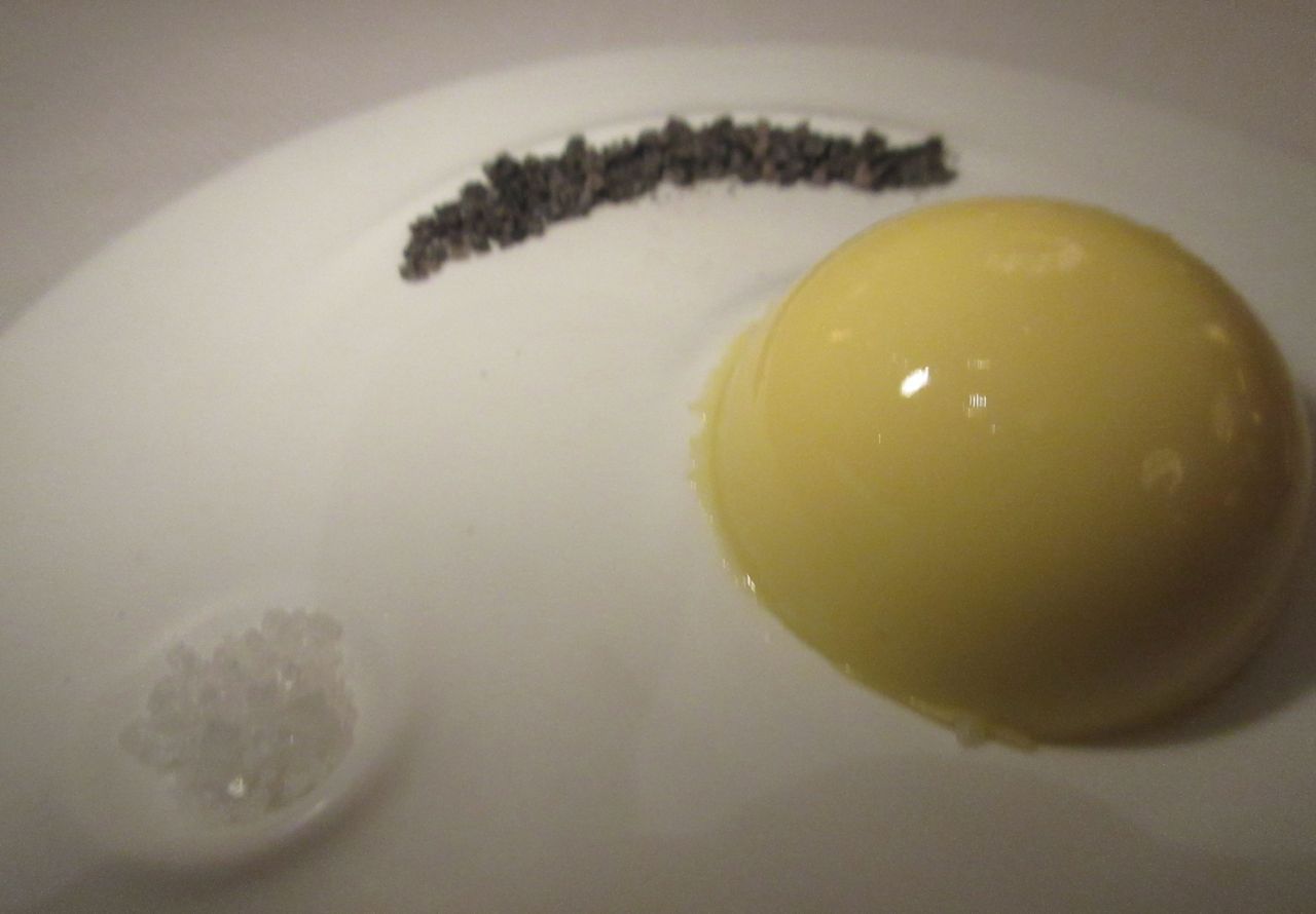 The bakery courier piles Bob’s bread plate high and sets down a saucer with a shiny yellow egg yolk of butter, an anthill of coarse sea salt and a charcoal line of smoked salt. The captain passes a small driblet with too many ingredients to remember. It reminds me of the too many teensies in that disappointing birthday dinner.
