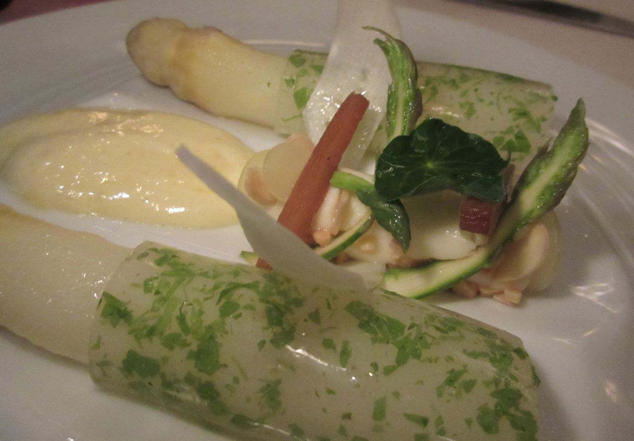 “I’ve never had white asparagus I liked as well as green,” I had muttered earlier. “Somehow they always taste watery, as if canned or defrosted.” But not these white asparagus. Tonight’s voluptuous blond beauties are the Mae West of asparagus – coated in a glasslike glaze of chervil, with almond oil behind her ears and a nasturtium leaf corsage.