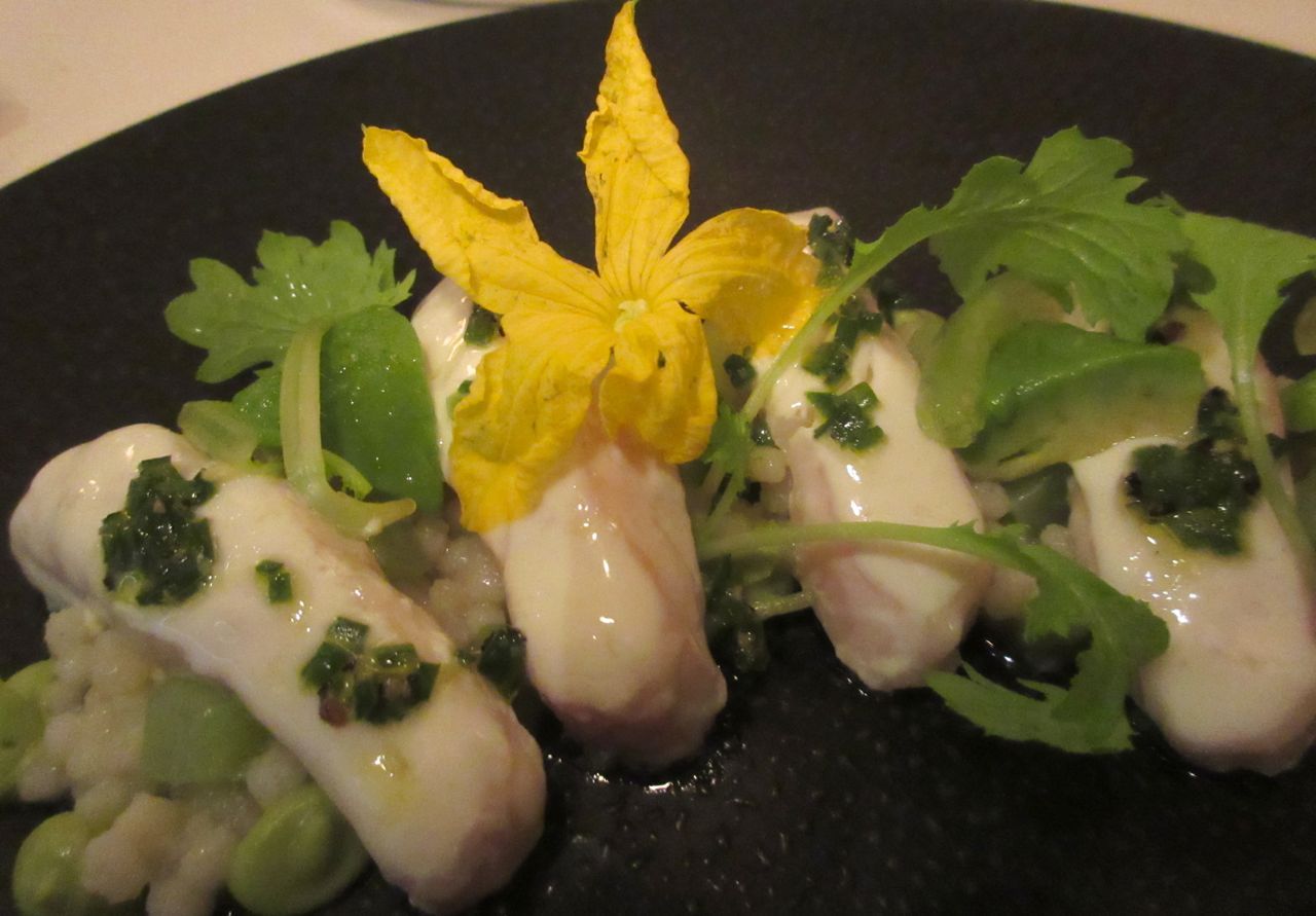 I’ve already dismissed the clumsy swordfish presentation, as I succumb to the miraculous other-worldliness of the black sea bass, dressed for the prom on a bed of semolina with an avocado-cucumber emulsion, a hint of wasabi and a yellow flower. I find myself intoxicated by the velvety pink flesh, slowly cooked, barely warm, painted with yogurt cream. The burgundy elegance of the Domaine Bzikot Puligny-Montrachet, “ suggested by the sommelier, financed by my companion, adds to the rush of free fall.