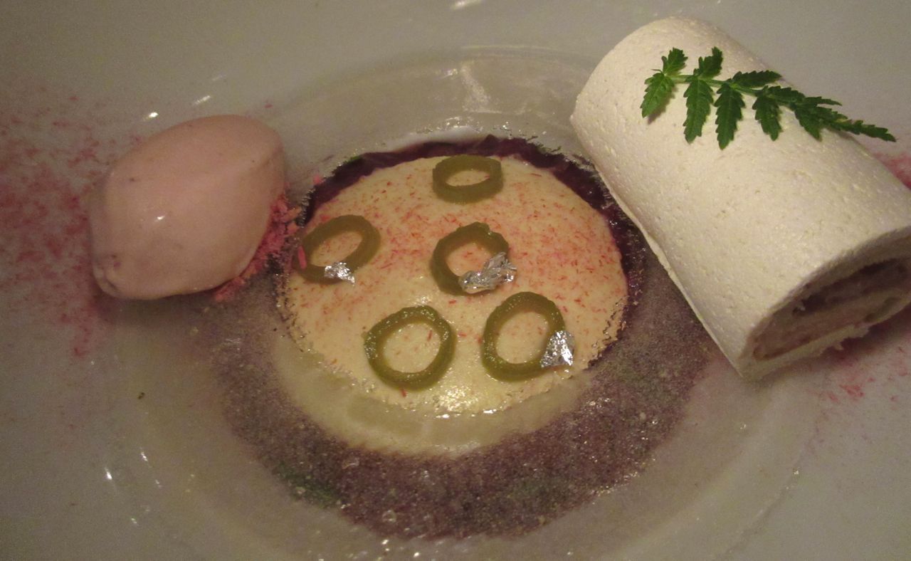 You might not notice a recurring new theme if you just sip your wine and eat. But study the menu of your dinner that the captain may offer to print up for you. Spruce tips. Wild mustard. Celtuce stems, Pennycress weed. Aralia (evergreen) tempura. Goji berries. Knotweed. Does that sound like someone’s been foraging? Does the devotion to sticks and leaves and weeds bring to mind Blue Hill Farm or seem a tad Noma?
