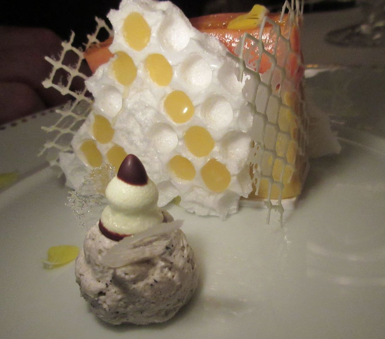 Lemon-bee pollen sorbet accompanies Honeycomb meringue with mango and papaya.