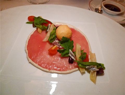 But then the featured amuse arrives – a variation of beets in a trio set on a black wooden brace that fits across the service plate. Very fancy furniture, but so are the beet miniatures. Bob is won by the beet puree with cardamom, basil oil, Granny Smith apple and micro anise. The marinated shrimp with horseradish vinaigrette, on a roasted yellow beet with pistachio, gets my attention. Small, yes, but aggressive.
