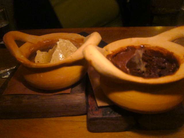 Roasted pineapple and a rich chocolate dessert arrive in small terra cotta bowls.