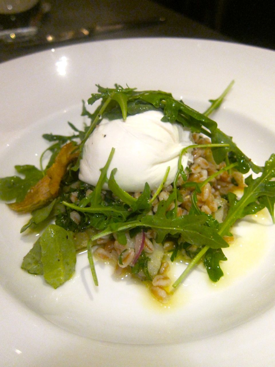 Burrata atop a hill of farro, red onion and marinated artichokes in anchovy vinaigrette.
