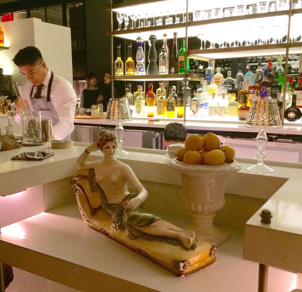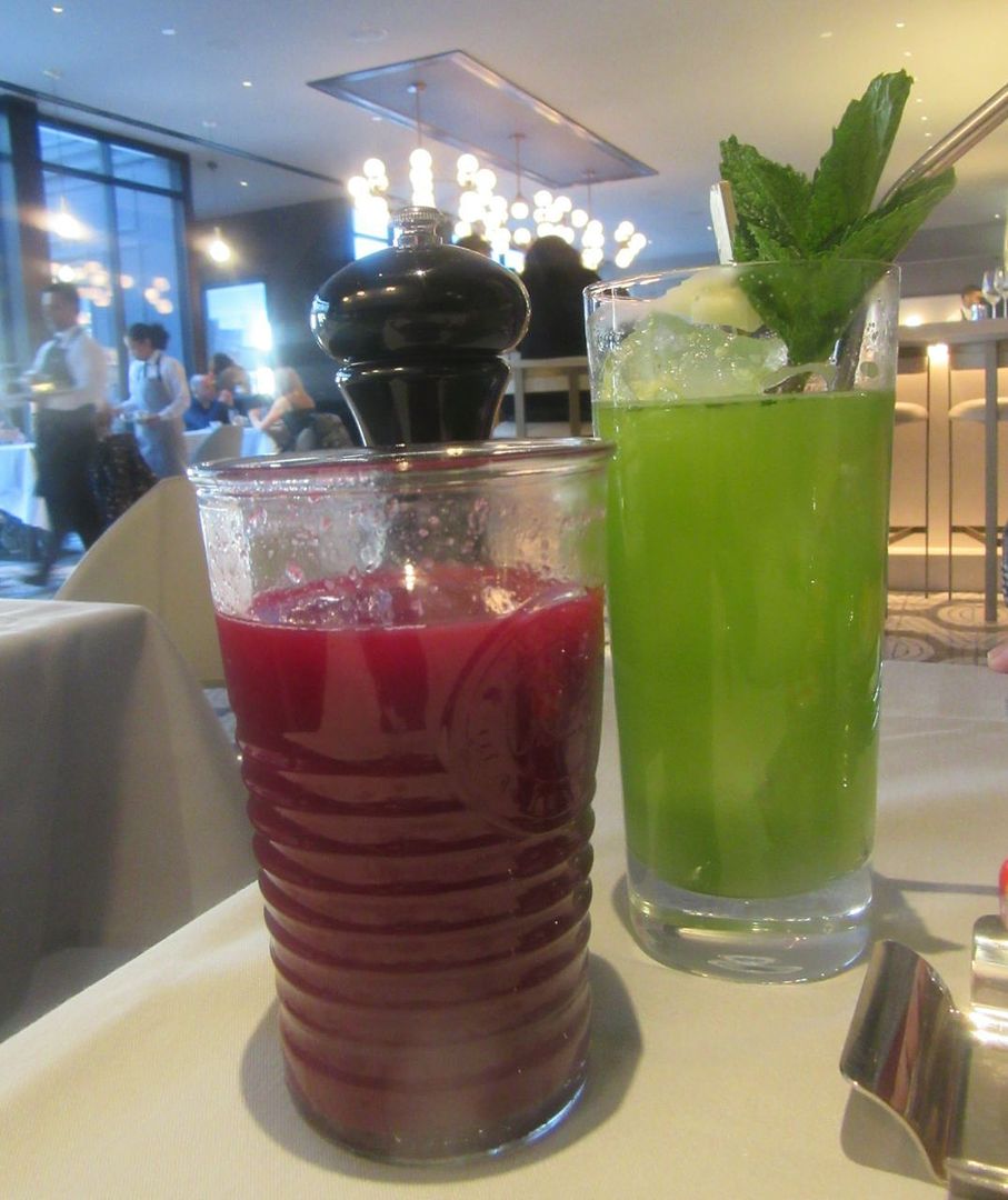 My friend chooses a green, alcohol-free cocktail. I’m high on fresh-squeezed blood orange.