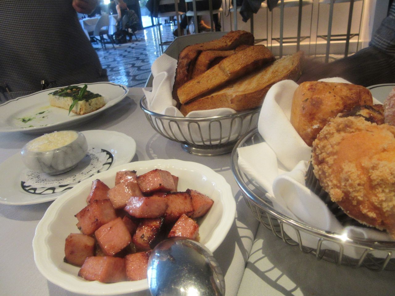 Nothing’s wrong with the pesto bruschetta – well, maybe it would be better for lunch. But I’m instantly distracted by the mixed pastry basket –“Five Pieces of our Best,” promises the menu. Yes. Yes. Yes. Muffins, an Italian donut, puff pastry — each one is different, which means I have to taste every one. With the house’s special butter in a doll’s house dish alongside. Yes, that too.