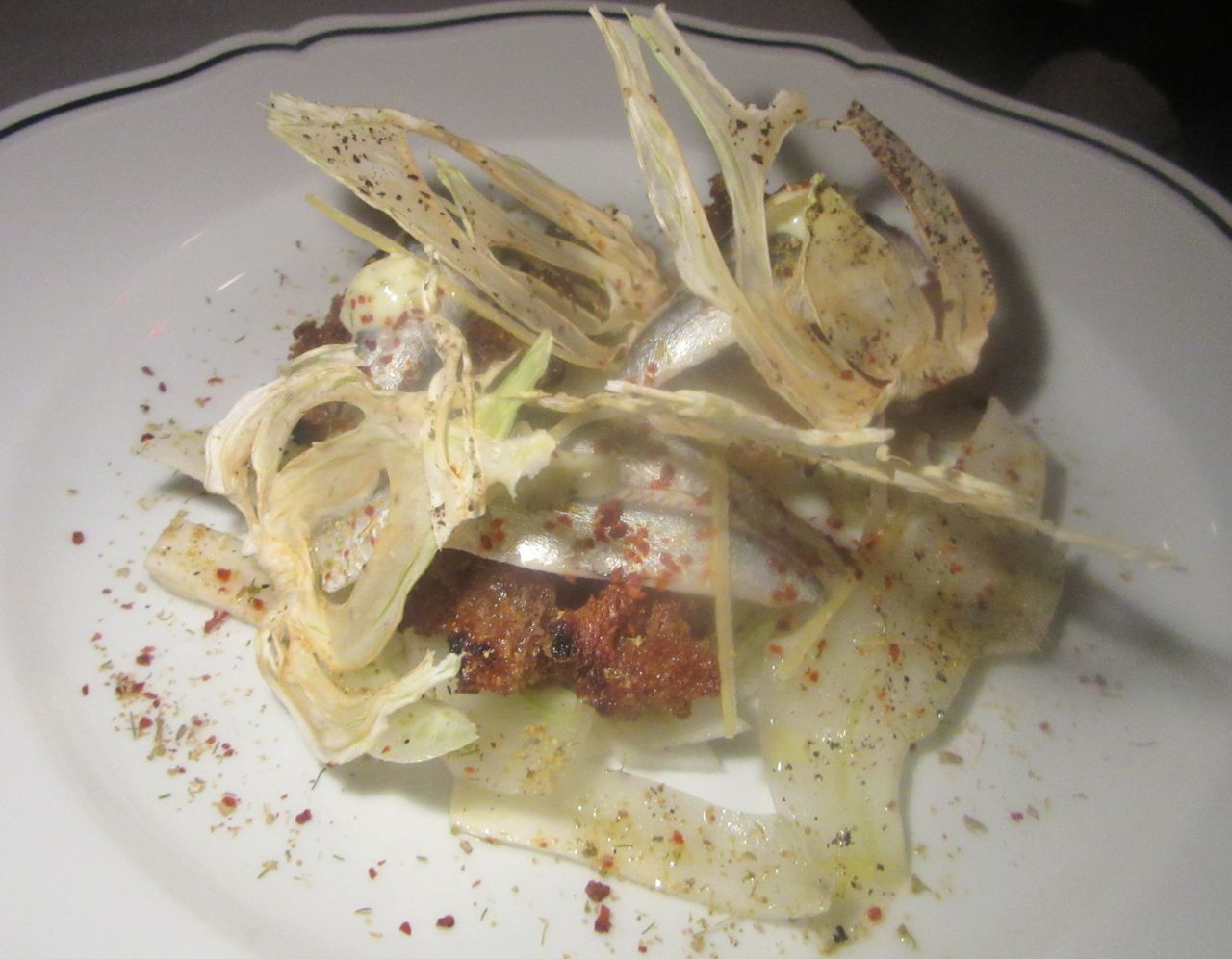 I recommend the fresh anchovies with fennel three ways and the frisée insalata with pepperoni and potatoes.