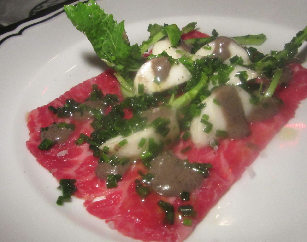 Lush short rib carpaccio with turnips and optional grated black truffle was the winter option of this dish.