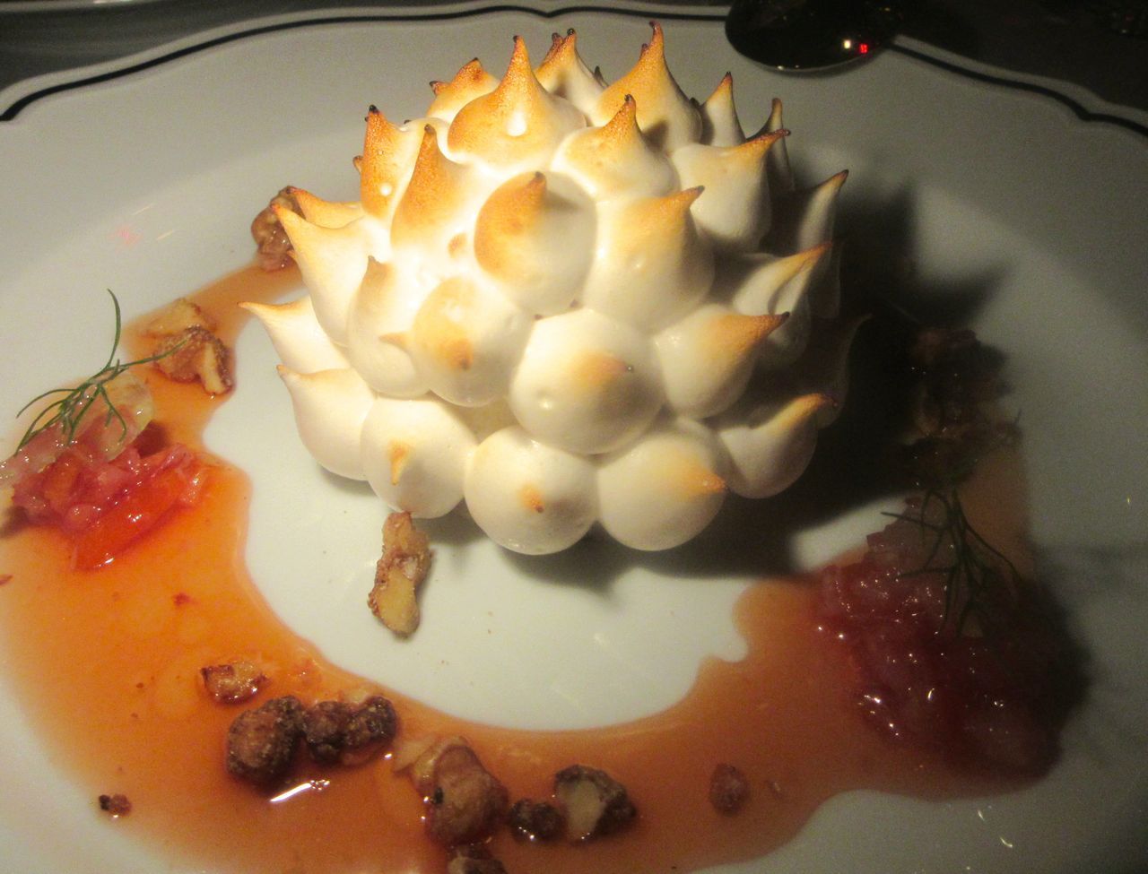 Often on these reviewing excursions, everyday humans decline dessert. But they usually surrender when I suggest just one to share. With pastry star Michael Laiskonis in charge, La Sirena’s dolci deserve more attention. The semifreddo layers blood orange sorbetto and frozen honey mousse draped in meringue.