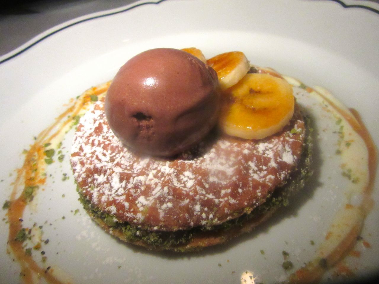 Serious chocolate lovers might insist on the crisp chocolate pizzelle with chocolate gelato, chocolate caramel, and apricot jam. But my favorite is the classic pine nut tart with cider raisins, Grandmother-style. It comes with olive oil gelato and sits on a plate streaked with red wine caramel.