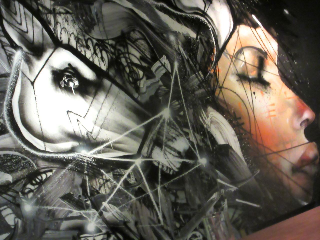 David Choe is the painter. Somehow as a backdrop for dinner, this works.