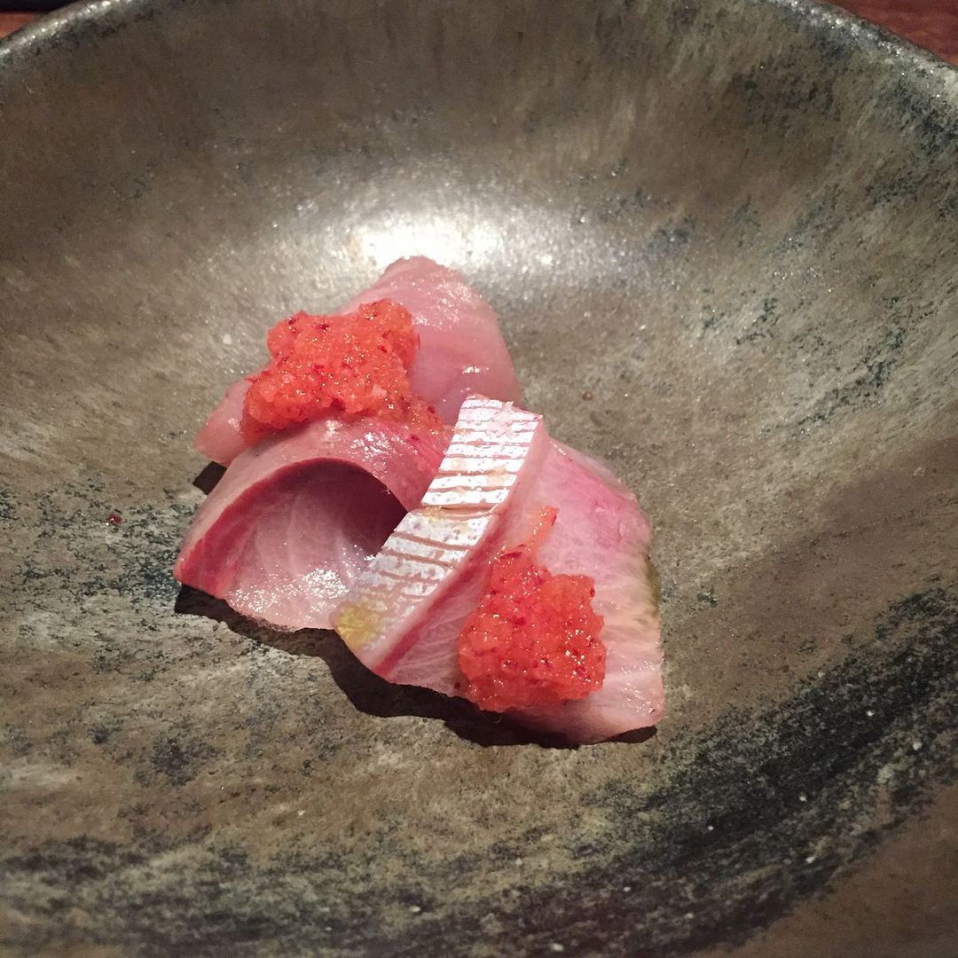 Rare wild buri sashimi from three parts of the fish is topped with pickled radish.