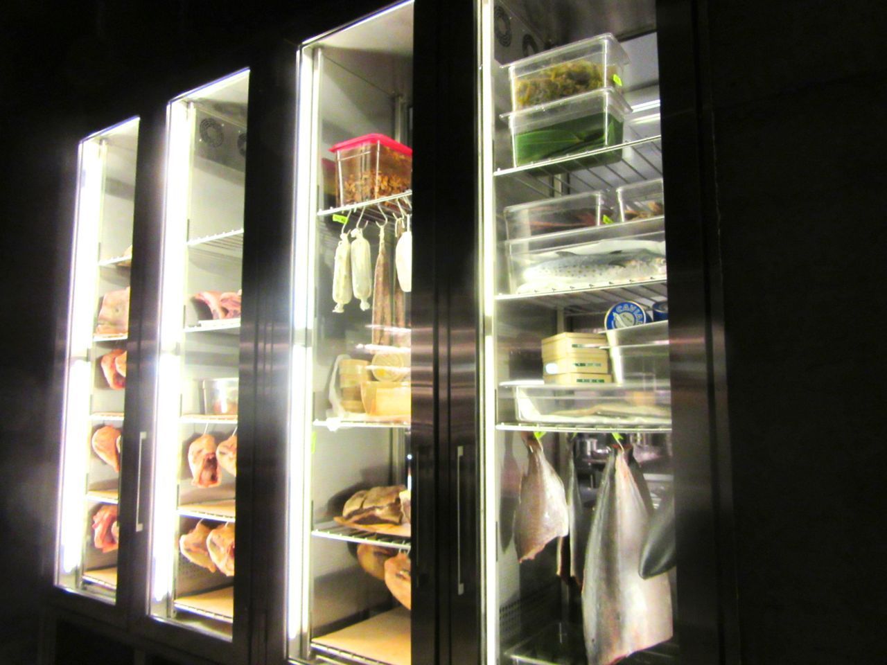 Meat, birds and fish hang on hooks in the glass refrigerator wall behind us.