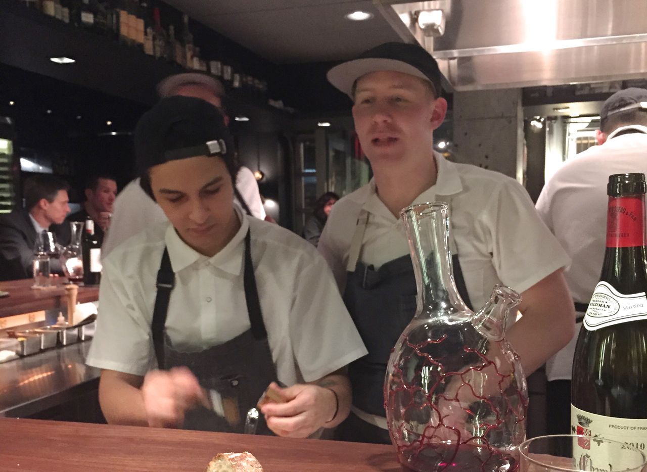 I’m not sure if the fermented apple and carrot palate cleanser comes before or after the bread — marvelous bread — and butter. Perhaps it’s meant as prep for the signature grated frozen foie gras with lychees and Riesling jelly, no longer so shocking. Is it possible? I almost actually like it. Could be I’ve mellowed. Could be the Burgundy effect.
