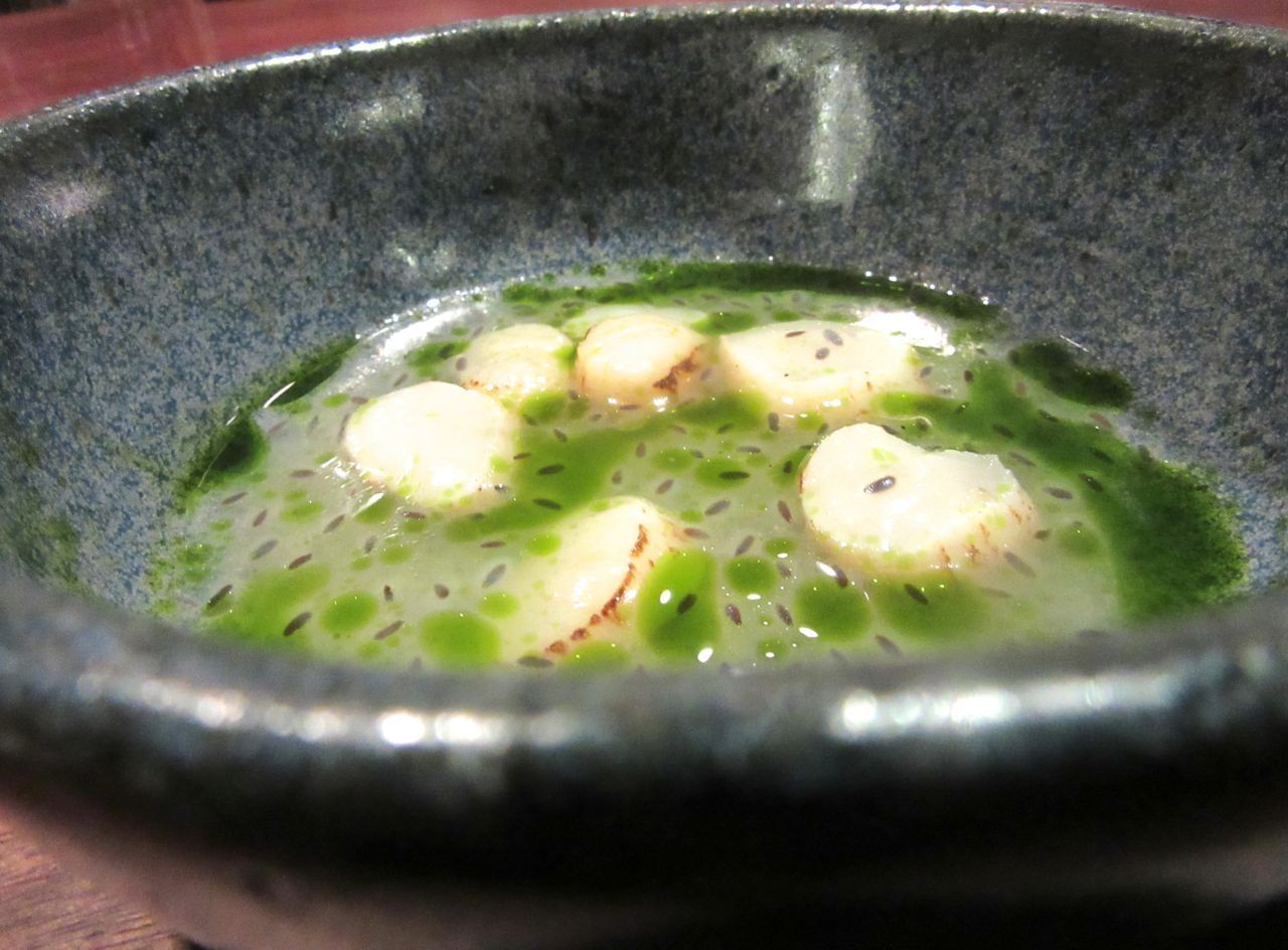 Raw scallops in pineapple dashi with basil and dehydrated basil seeds.