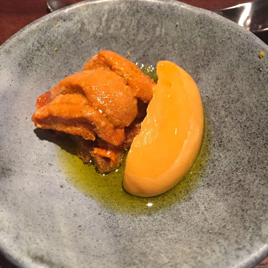 Uni with a custard of chickpea hozon – an invention of the Momofuku Culinary Lab