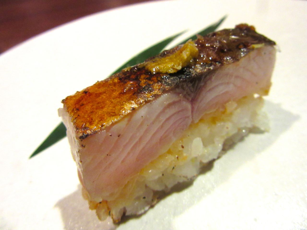 Seared mackerel sabazushi on loosely crisped rice – eat it quickly before it falls apart.