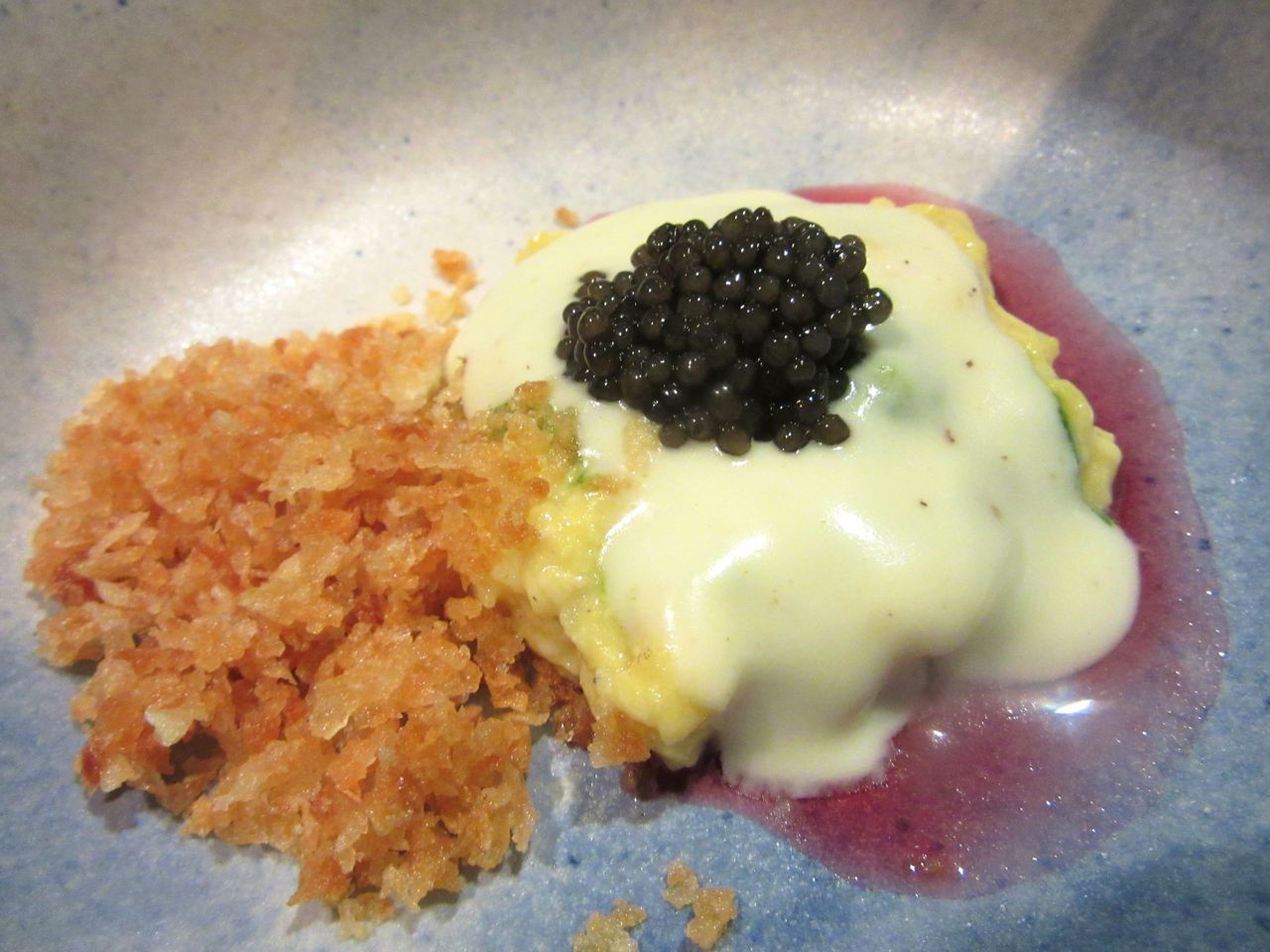 Soft scrambled egg topped with more eggs (osetra) alongside potato crumble pleases me. Breakfast, after all, is a meal I love and a segue from the French amuses and Japanese riffs that remind me Chang’s kitchen is American, after all. I spot him again, briefly scanning the action from the kitchen perimeter, scowling, then escaping backstage.