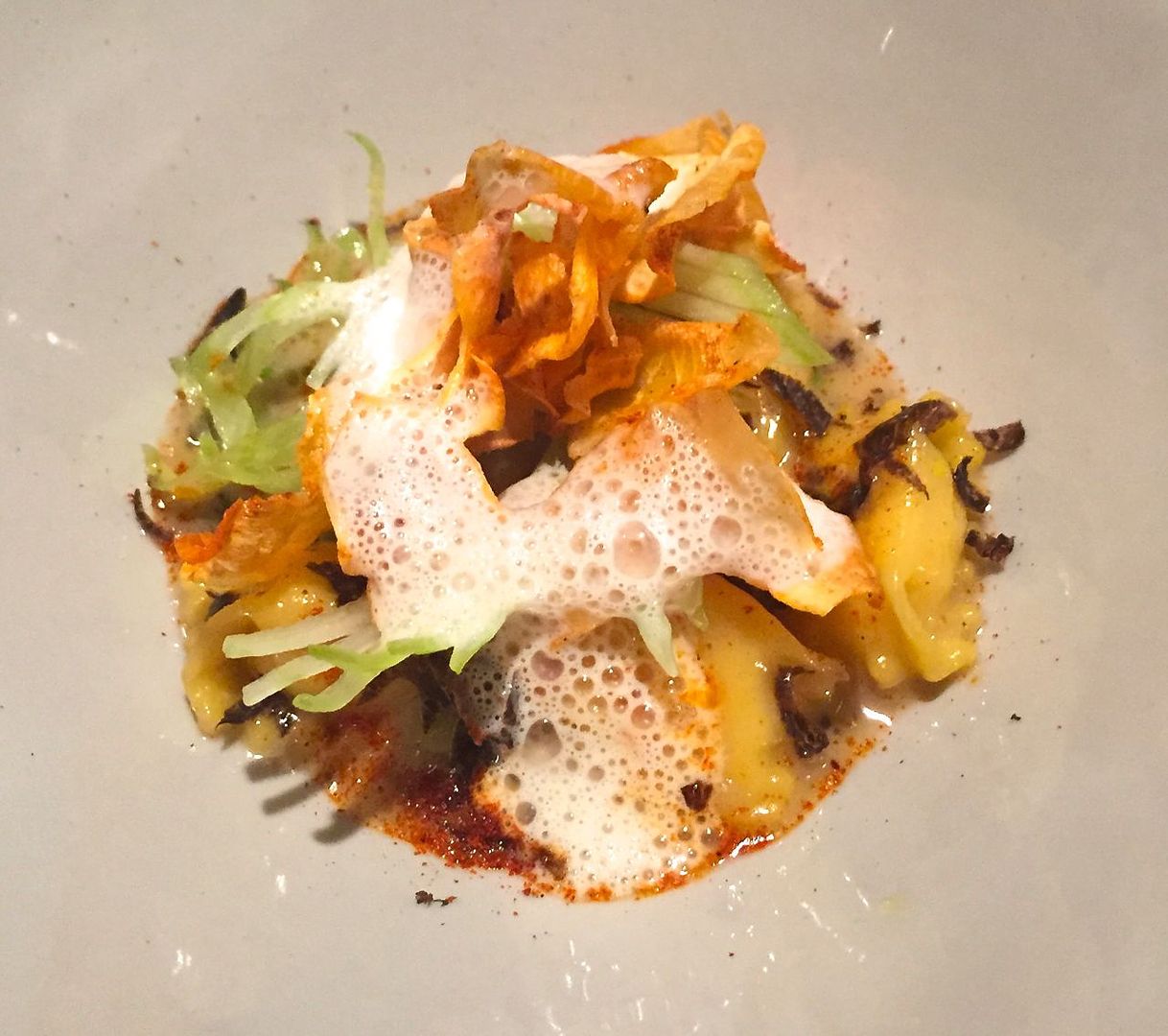 Celery root and black truffle agnolotti with tandoori-dusted celery root crisps.