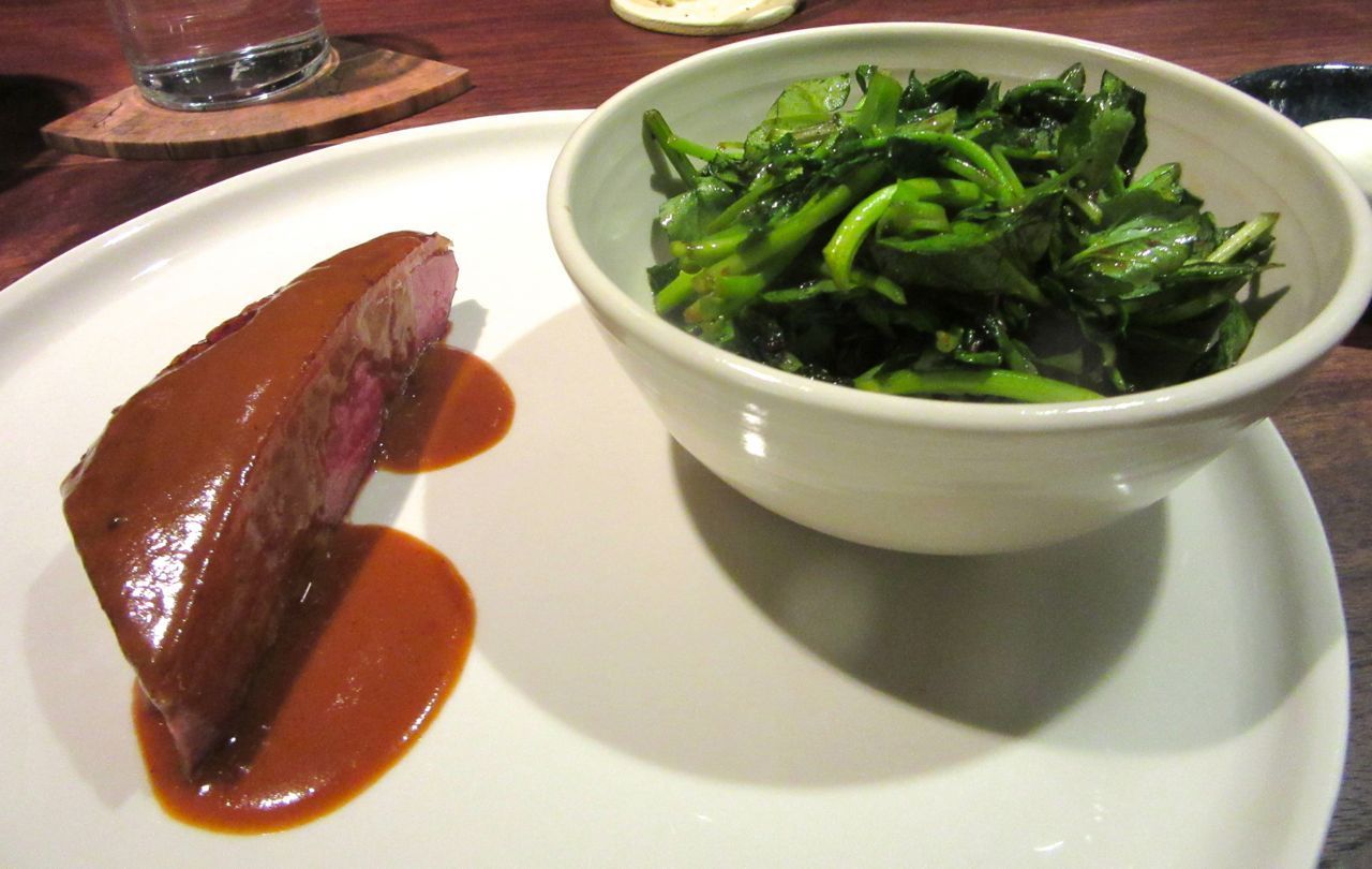 A thick wedge of “aged 10 to 14 day” Muscovy duck breast lands at a moment when I’m feeling close to enough. There is a bowl of cooked greens, too, salty from XO sauce, and an oval of crème fraîche to thin the bird’s lime pickle sauce, an overwhelming sludge I instantly try diluting.