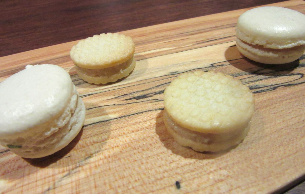 Now he presents our farewell cookies: a duo of macarons stuffed with sunflower hozon.  And vanilla cookie sandwiches layered with dulce de leche.
