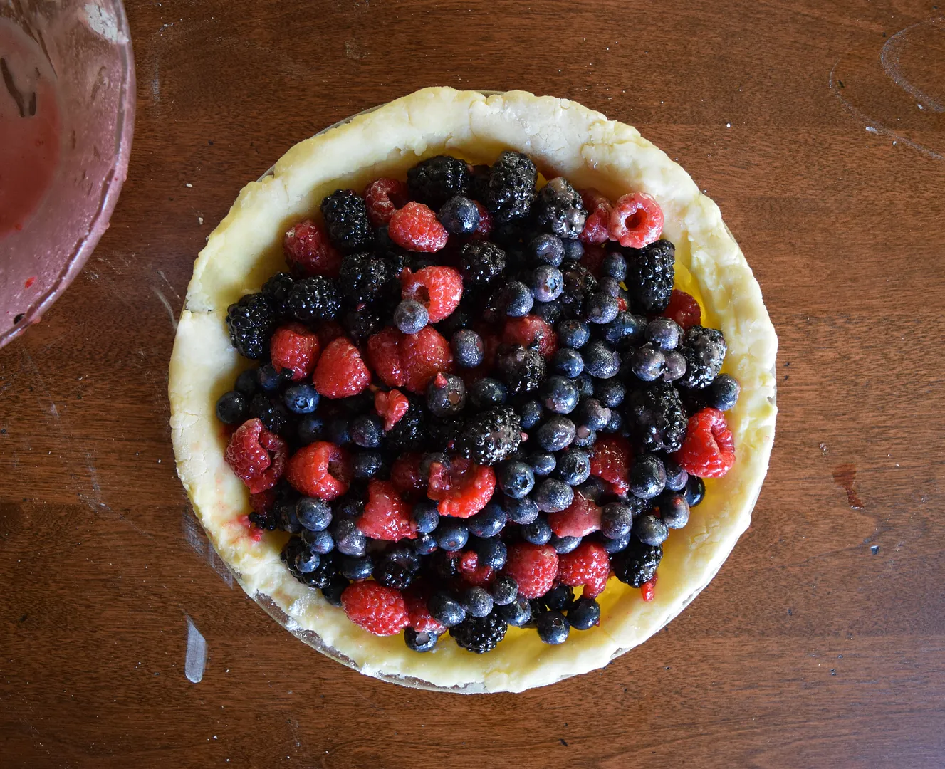 Roll one portion of the pie dough so that it is an inch or two bigger than your pie plate. Add the mixed berries.