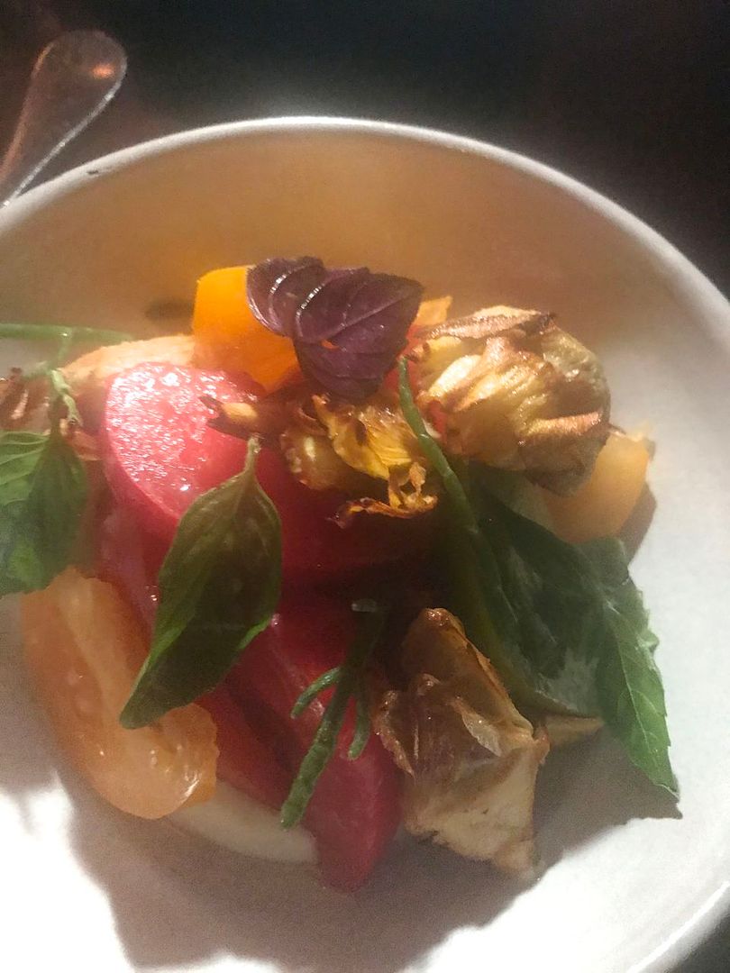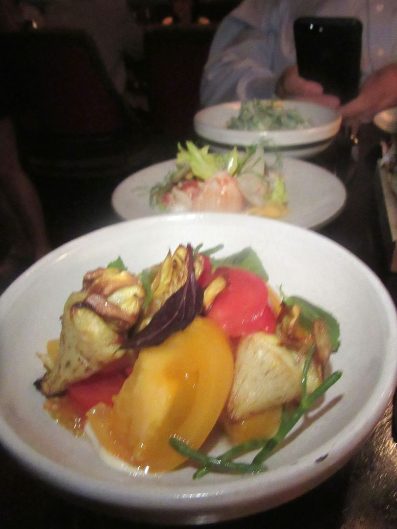 Wilfred’s photo of the tomato-artichoke salad is a little pale but the NoMad parlor dining room is dark.