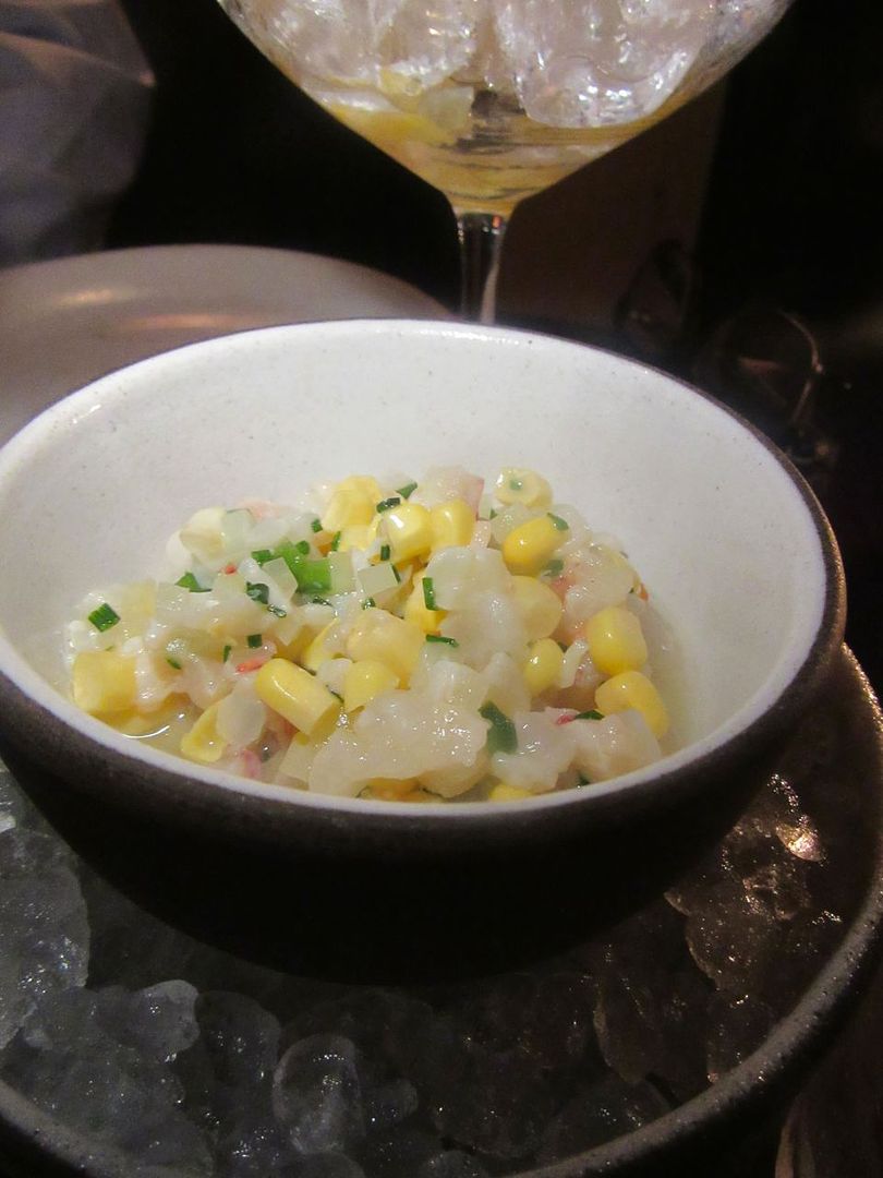 It’s Snacks, as the menu promises. He recites the roll call. Lobster ceviche with corn in a bowl on ice, ribbons of miso-gazed tail, tempura-fried chunks with a side of sorrel aïoli and a little bowl of spices (powdered nori and vinegar, I learn later) and lettuce and radish thins for wrapping. I’m distracted with my camera and miss most of the dialogue.