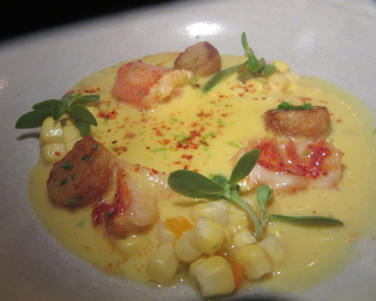 Lobster, potato and Fresno peppers float in the savory corn chowder.