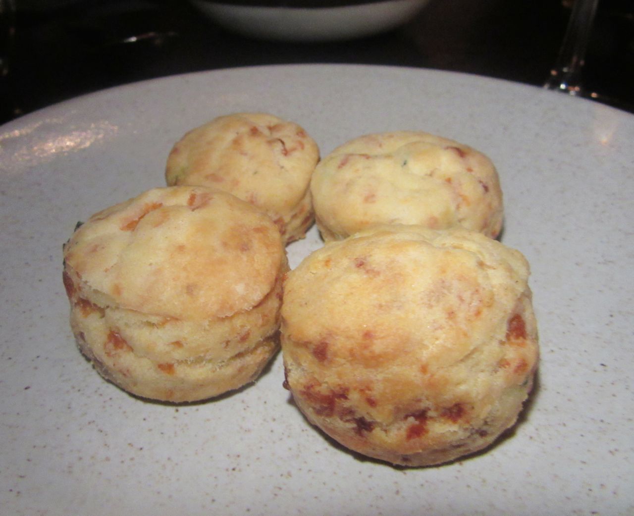 The soup is excellent, too. Corn chowder with lobster, potato, and Fresno peppers. The little sprigs of green are micro purslane. I’m disappointed when I realize how shallow the soup bowl is. Wilfred and I share a big- spenders laugh. The paucity of soup. But there are four cheddar cheese biscuits – and I’m wild about biscuits.