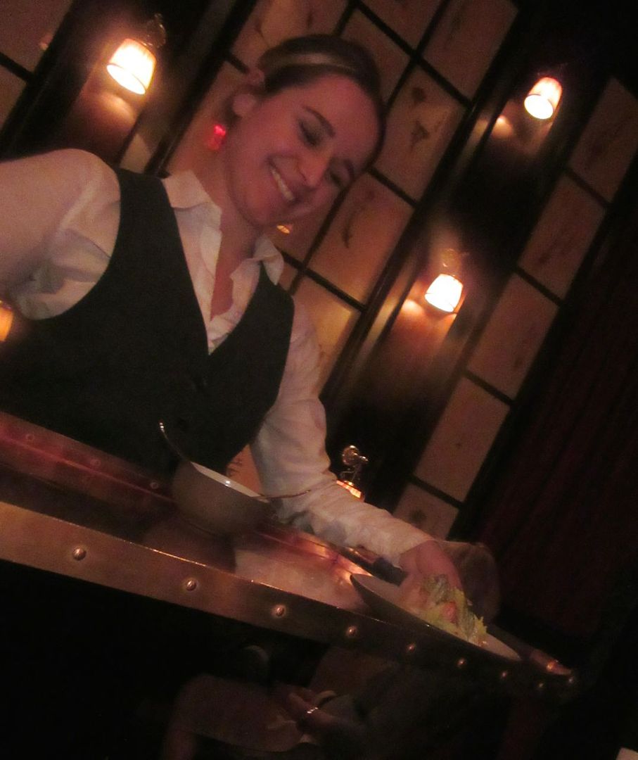 A server is trailed by a nubile young woman balancing a tray with our dishes on it that he then delivers.