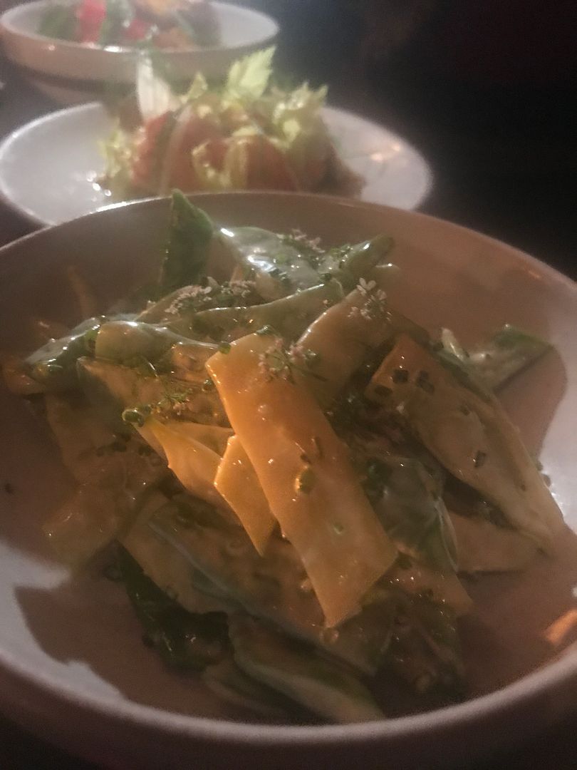 Green and yellow runner beans are dressed with an aîoli made from roasted lobster oil, lemon juice, and salt.