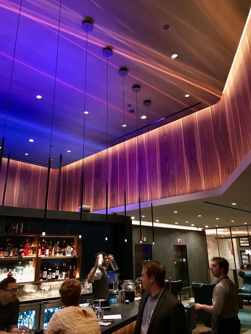Not many of the 50 seats are occupied that first evening, as we settle at a matte black table with an odd plastic doily in the middle. An occasional solo diner might be a hotel guest too lazy to venture out. Is this music a little weird? I ask my companions. It’s mostly repetitive sounds. I decide I like it. Then it morphs into guitar. My pals, meeting for the first time, are getting acquainted, and urge me to handle the order.