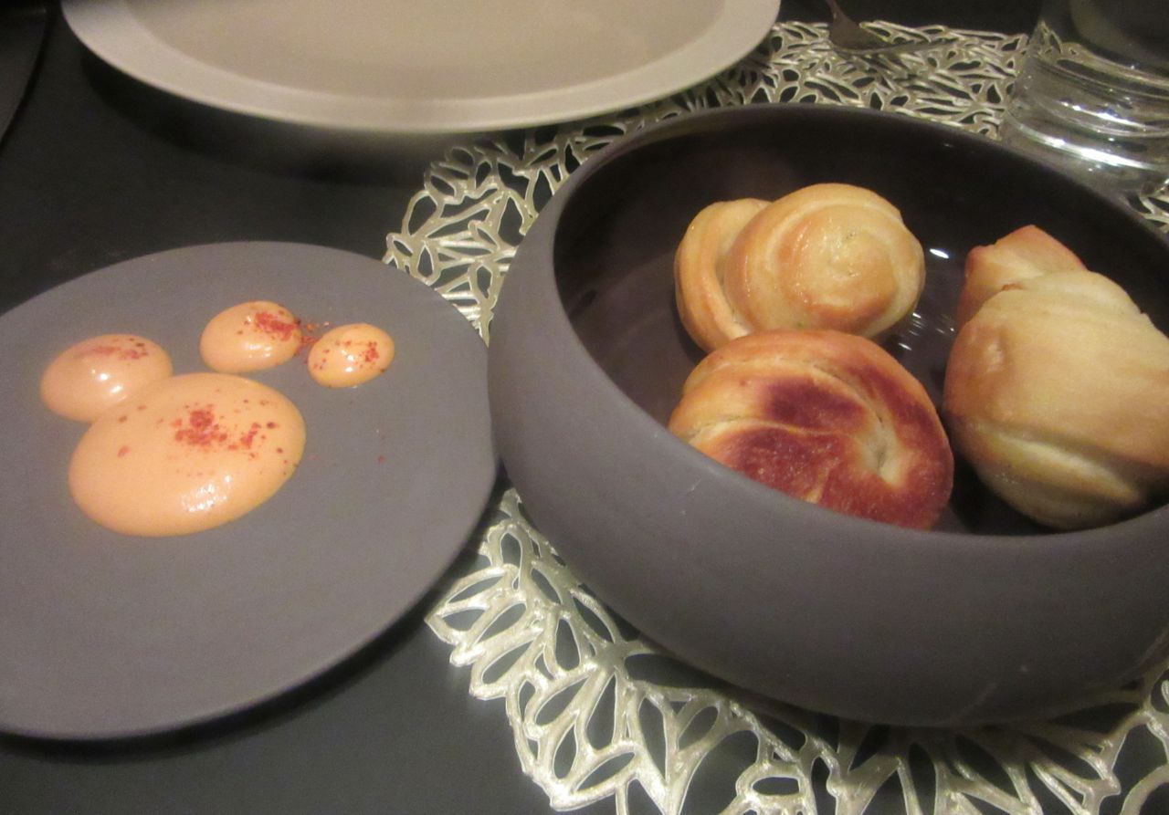 Small folded cheese buns (pan de queso) arrive accompanied by a sauce of tomato crème fraîche sprinkled with espelette pepper in grey earthenware. Not just pretty, but delicious. We are debating asking for more when a generous amuse arrives. Three curls of raw fish, miniatures of expensive crudos on the menu. Toro Bluefin belly painted with olive oil and sprinkled with caviar. Hamachi with piquillo pepper in a saffron emulsion. And fluke with chickpea powder, lemon, and sea beans.
