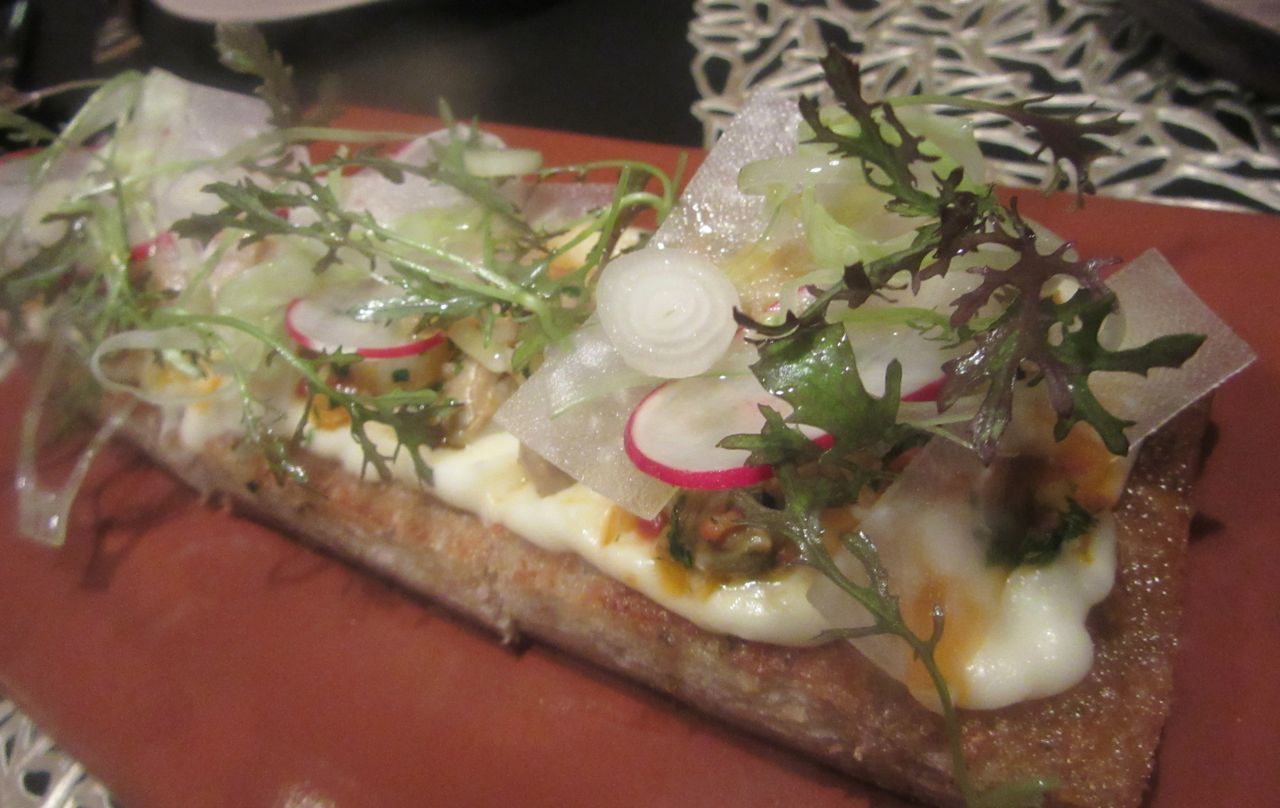 The kitchen, carved out of this restricted space, is so small that the expeditor stands in the dining room directing the flow, with piles of dishes stacked in full view at his feet. But Chef Michael Han’s menu is loaded with delicious surprises, Basque style tapas, casseroles and grills. I start sending friends there after just two dinners, pleased and excited by almost everything I’ve tasted. Except for some over-salting.