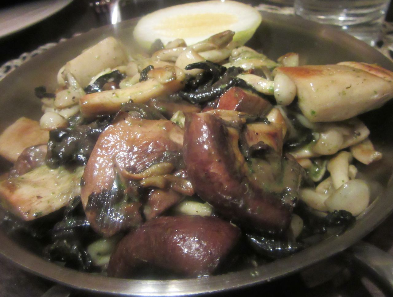 The mushroom collection is full of the spring harvest, slicked green with parsley olive oil.