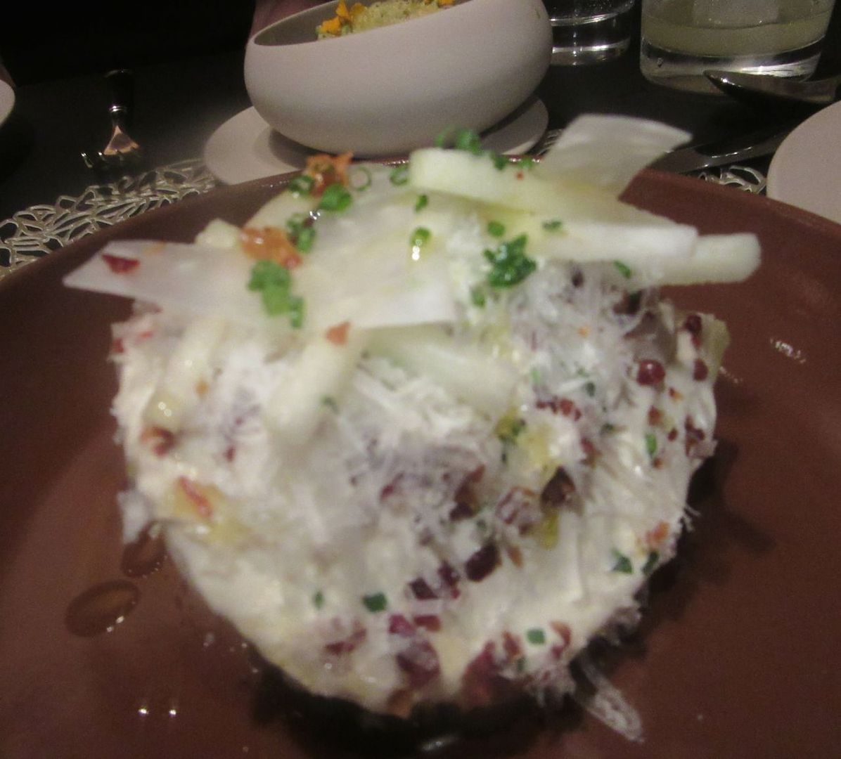 Different friends are equally eager to let me order and seem puzzled when the first dish that arrives is only a salad, mostly lettuces with brioche croutons. It seems a bit too salty, but I’m guessing that’s the Cabrales blue cheese dressing. There’s a choice of three: Jerez vinaigrette might have been less salty.